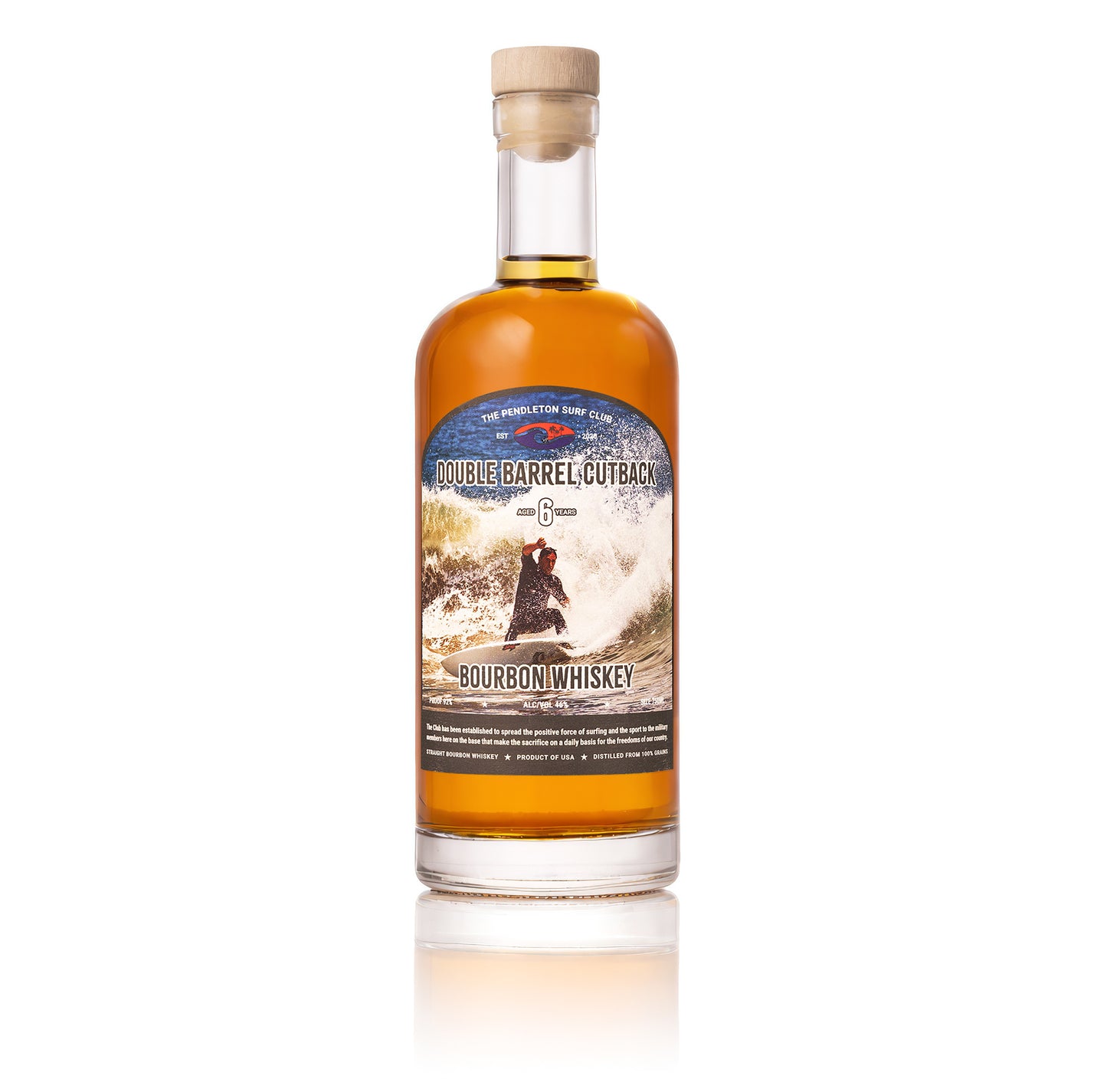 Aged 6 years and bottled at 92 proof, Double Barrel Cutback is a bold yet refined straight bourbon whiskey crafted in tribute to the Pendleton Surf Club. Distilled in Indiana and finished and bottled by Pacific Coast Spirits in Oceanside, California, this small-batch release honors the spirit of surfing and the strength of the military community stationed at Camp Pendleton.